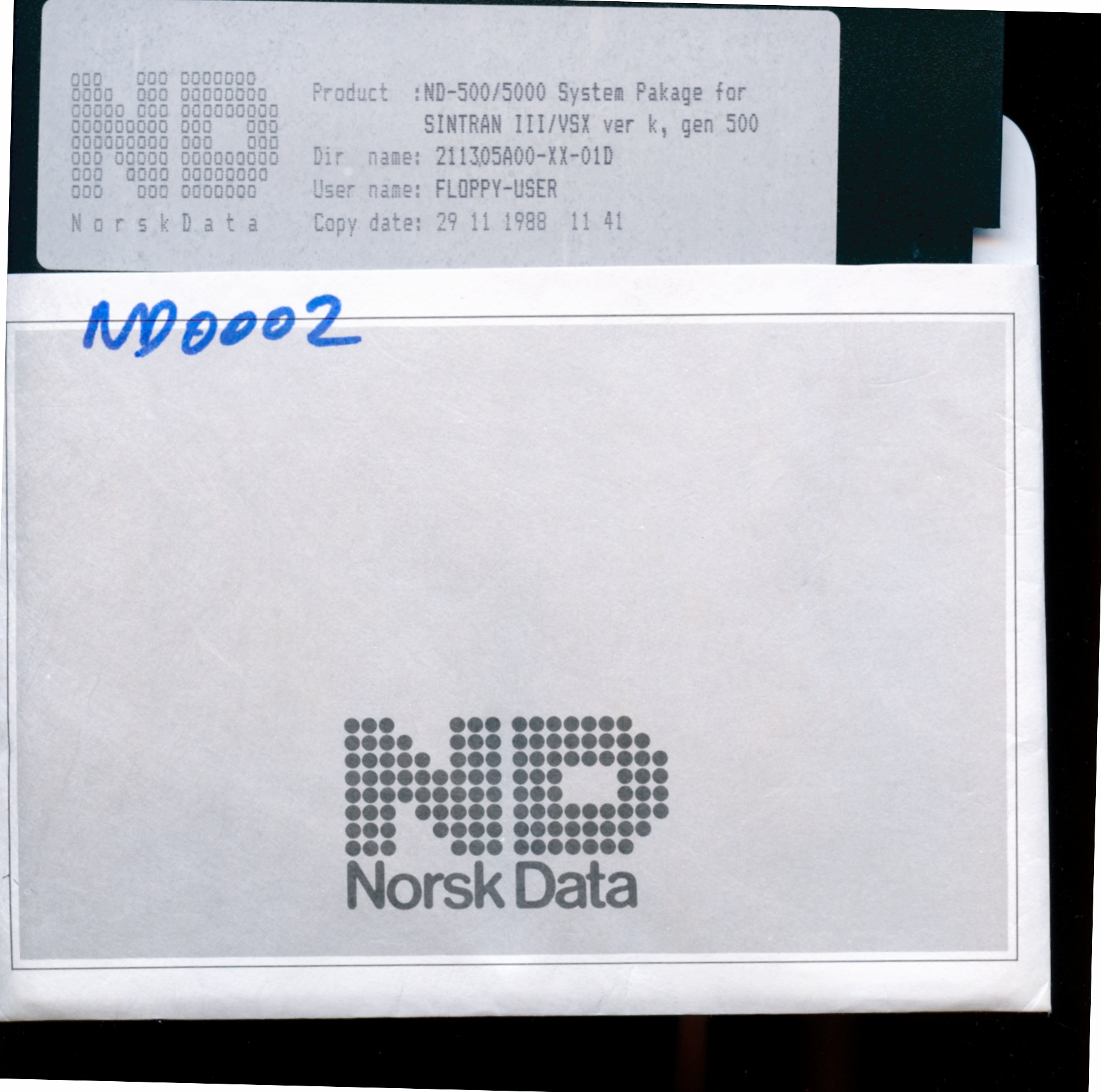 BitStore.Metadata_version: 1.0 BitStore.Access: public BitStore.Filename: ND0002.PNG BitStore.Size: 1842328 BitStore.Format: PNG BitStore.Ident: 30001651:1 BitStore.Digest: sha256:7d46845cc16d34f2a0106bd355e1ed0bd0c68330e7e7073a28da50862c6a5b0b BitStore.Last_edit: 20201016 phk DDHF.Keyword: COMPANY/NORSK_DATA/DISK Image.Summary: 211305A - ND-500/5000 System Package for SINTRAN III/VSX ver k, gen 500 Image.Description: Picture of floppy disk, label reads: Product :ND-500/5000 System Package for SINTRAN III/VSX ver k, gen 500 Dir name: 211305A00-XX-01D User name: FLOPPY-USER Copy date: 29 11 1988 11 41 *END*